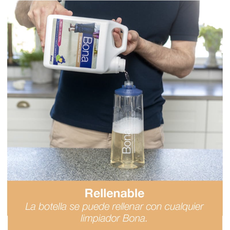 Ergonómica y fácil de montar, pero sobre todo, fácil de utilizar. Se rellena con un cartucho limpiador especialmente diseñado por Bona que nutre y protege los suelos de madera aceitados