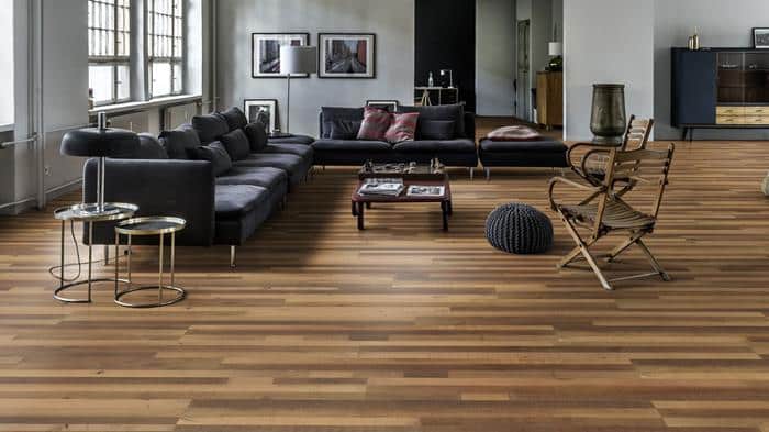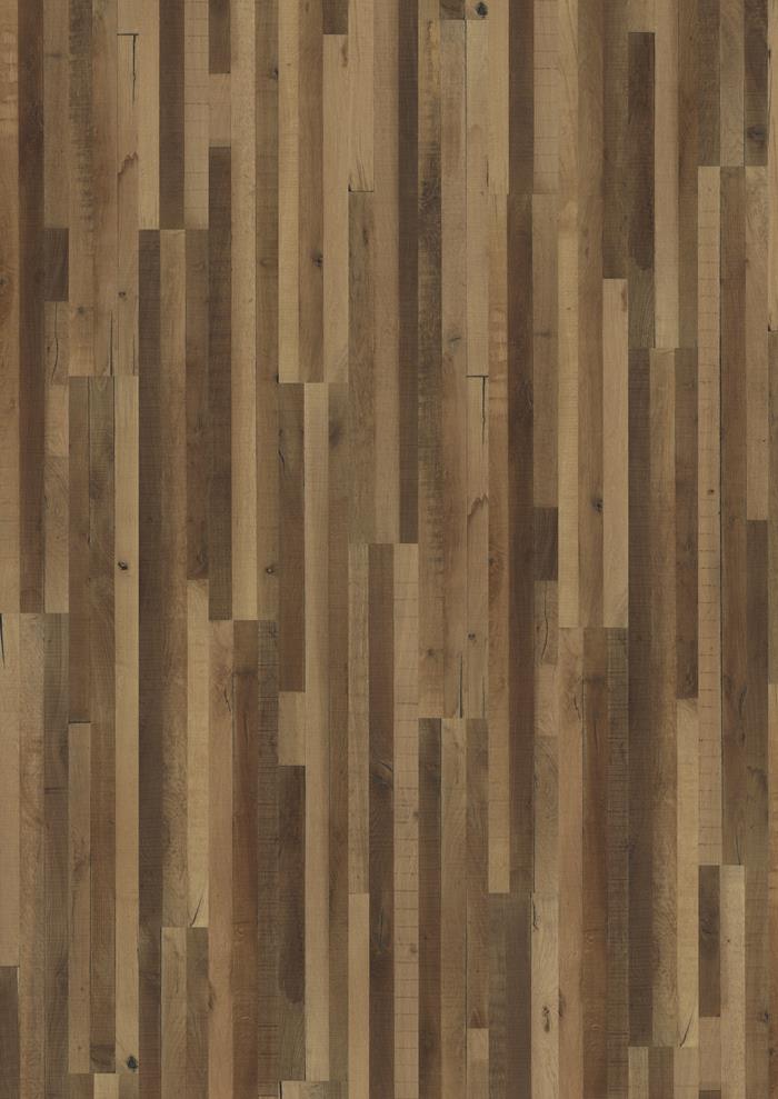 Este parquet Kährs  ahumado de 3 lamas de la colección Da Capo presenta una variación de color intencional en las tablas, que van desde el rubio decolorado hasta los ricos tonos de algarrobo para crear una apariencia dramática y desgastada. Los nudos, las grietas y las decoloraciones de las tablas dan como resultado una hermosa expresión envejecida. Cada tablón se cepilla cuidadosamente para resaltar el carácter de la veta y resaltar la textura natural de la madera.