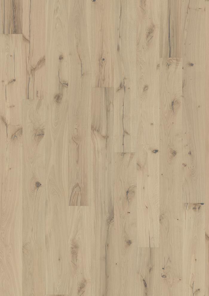 La mancha sepia apenas visible en este parquet de roble de una sola tira de la colección Boardwalk permite que se vean los tonos naturales, al tiempo que resalta una característica formación de nudos y grietas. Cada tablón se cepilla cuidadosamente para resaltar la veta y el biselado en los cuatro lados garantiza un aspecto clásico de tablón completo.