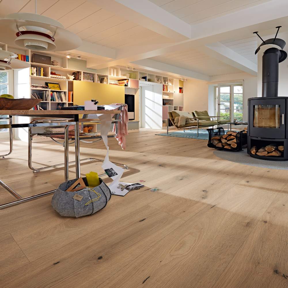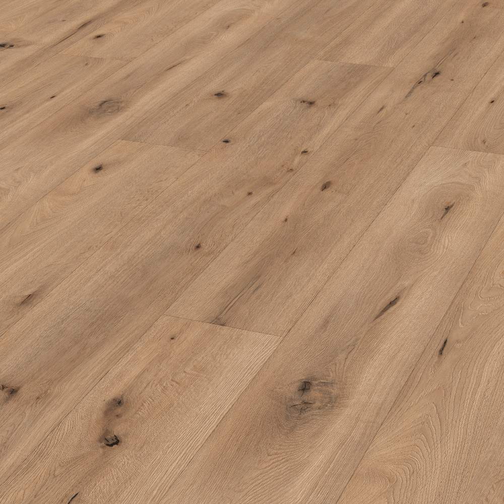 Por lo tanto, este suelo también puede colocarse en cuartos de baño. La superficie Diamond Pro resistente a los arañazos y el papel decorativo antiestático completan las ventajas técnicas de este suelo.
