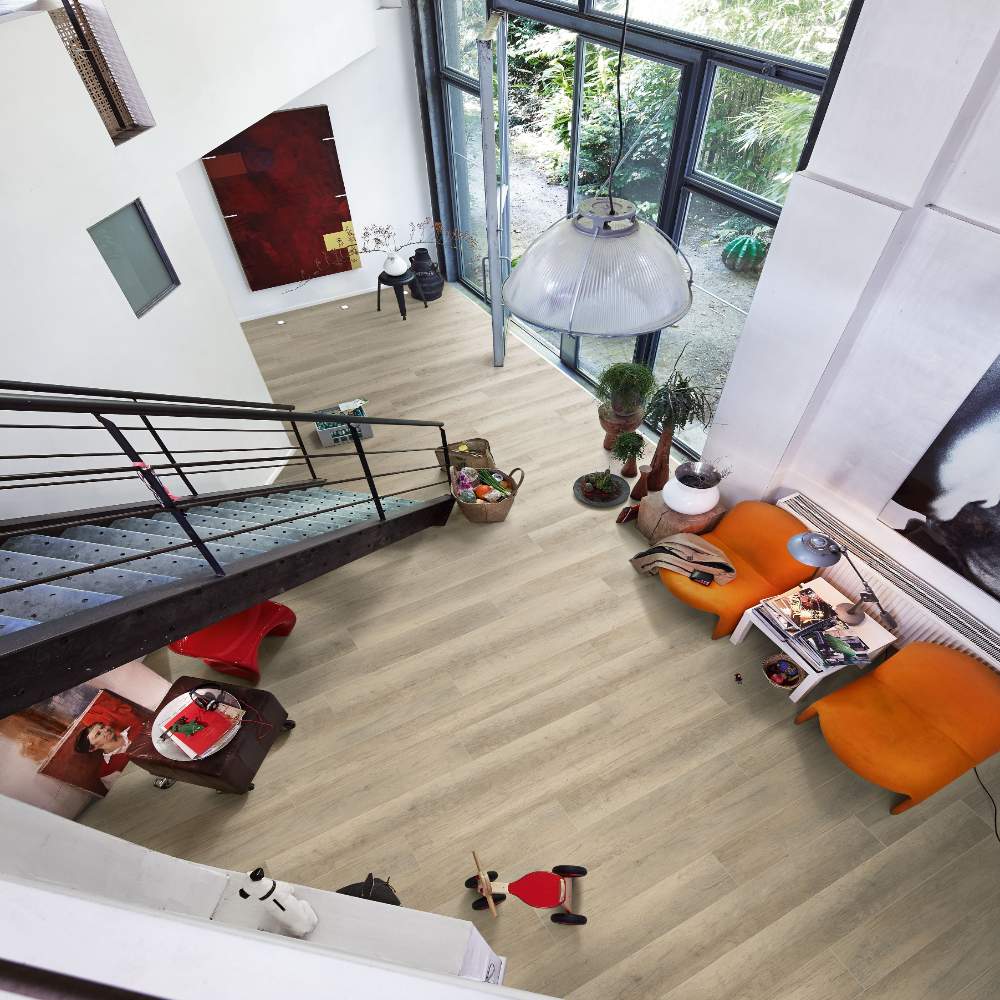 Por lo tanto, este suelo también puede colocarse en cuartos de baño. La superficie Diamond Pro resistente a los arañazos y el papel decorativo antiestático completan las ventajas técnicas de este suelo.
